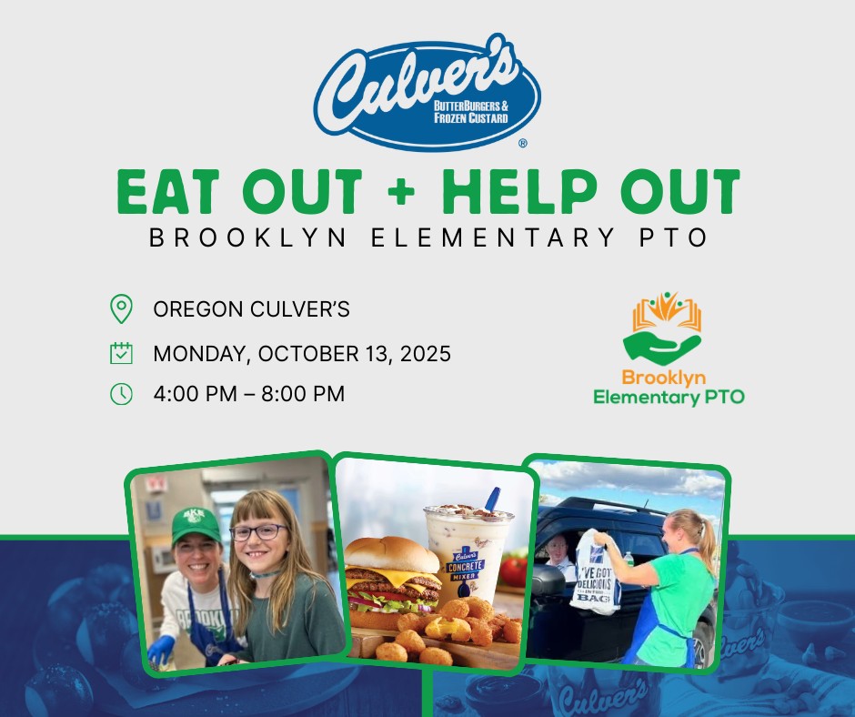 Culver's Share Night on Monday, October 13, from 4-8pm at the Oregon location. The PTO receives 10% of all eat-in, drive-thru, and curdside orders at this time, with the proceeds going towards feeding the Brooklyn Elementary teachers at future parent-teacher conferences.