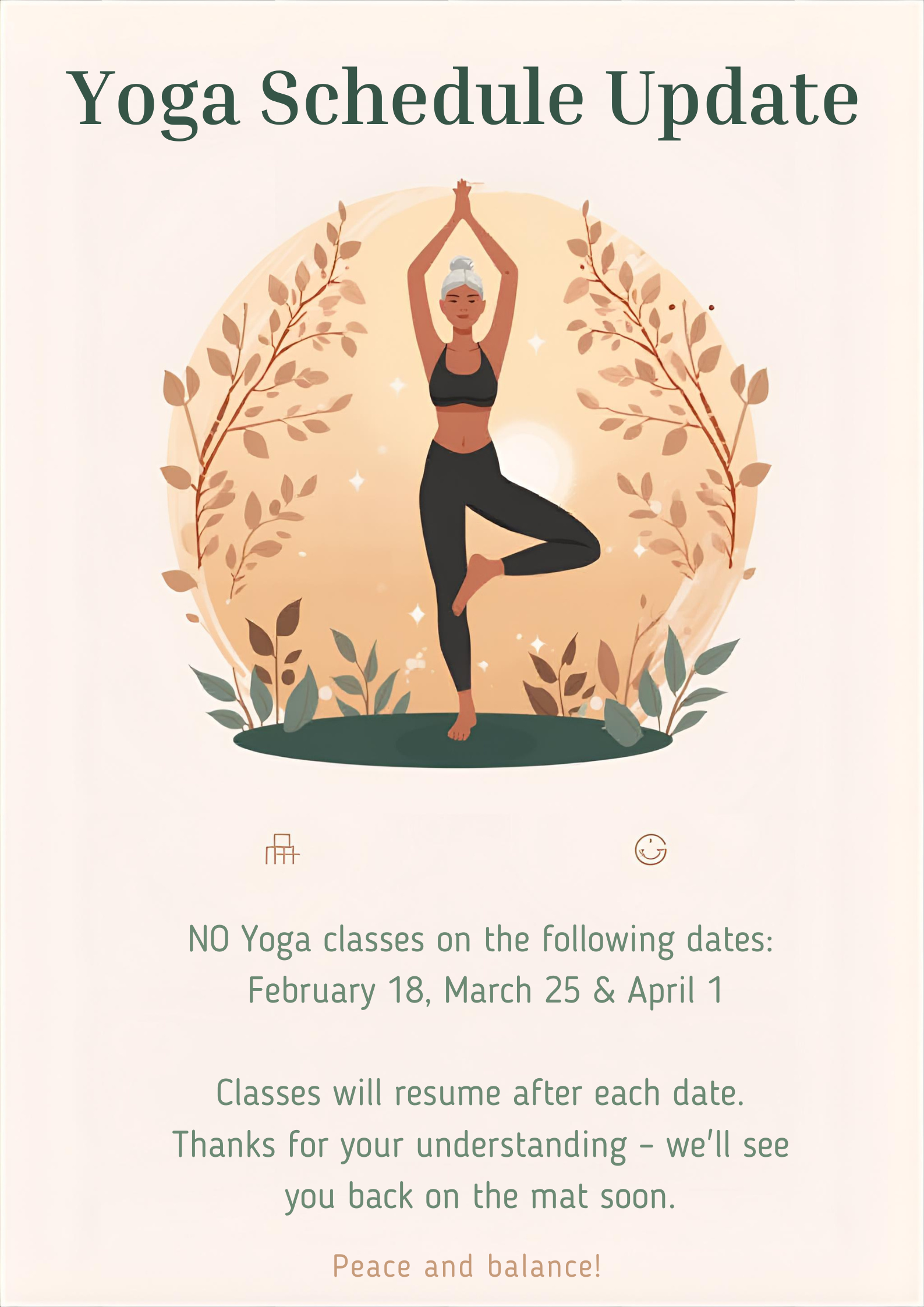 No Yoga Classes on Feb. 18, Mar. 25 and Apr. 1, 2026